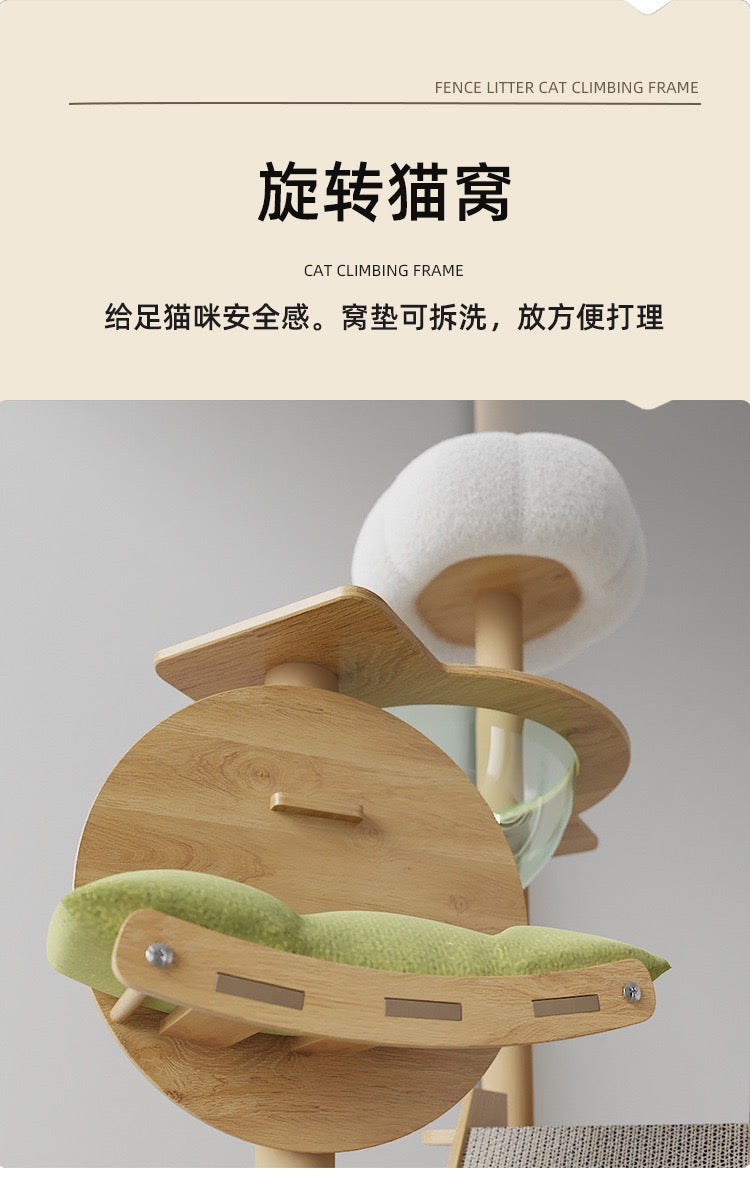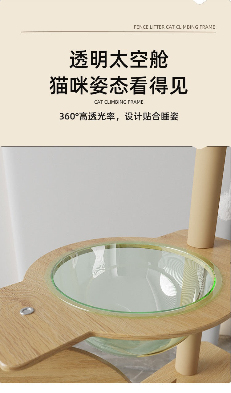 【精致设计】透明太空舱是这款木质猫树的独特亮点之一。它位于猫爬架的上层。通过透明材质,猫咪躺着也能观察周围环境,满足它们对环境的好奇心